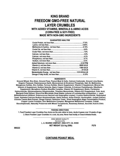 A budget friendly feed that is made with non-GMO ingredients, corn and soy free that promotes healthy birds and wholesome poultry products. Supports the additional nutritional requirements of colored egg layers.