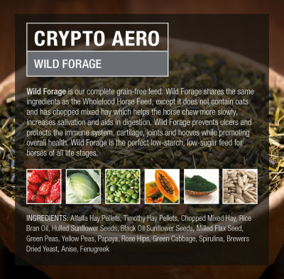 Crypto Aero Wild Forage Horse Feed a whole-food horse feed designed to be fed with forage and hay products. Formulated for both performance and pleasure horses in mind, this natural blend is made with ingredients grown from non-GMO seeds and is richly incorporated with vitamins and minerals derived strictly from whole foods including rose hips, green cabbage, papaya, spirulina and peas.